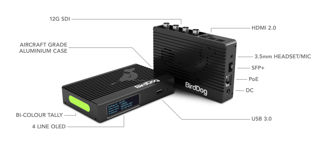 Following on from the award winning HD NDI® products, the 4K Family has been engineered from the ground up for real-world users. Built around BirdDog’s custom NDI® silicon chip and housed in an aircraft grade aluminium case, features include 12G SDI and HDMI 2.0 inputs and outputs, built-in cross converter, SFP+ port for 10GbE connectivity, active loop outs, audio intercom system, NDI® tally system, PoE, and compatibility with BirdDog’s Comms Pro and Central Pro apps.