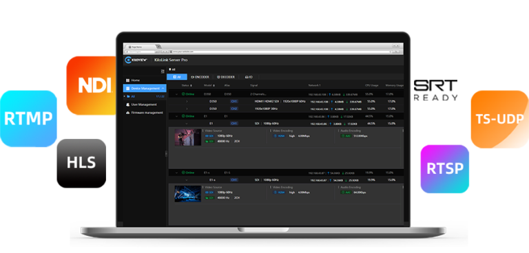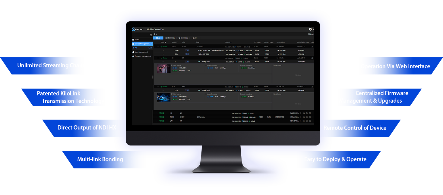 The enhanced KiloLink Server Pro provides management of unlimited number of devices. No matter how many devices or video sources are processed, you can easily register them to your software platform. Now, you can easily manage device status/ remote configuration/ model page switching, firmware upgrade, and more.