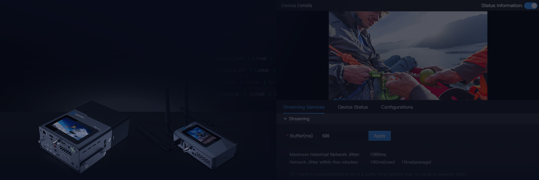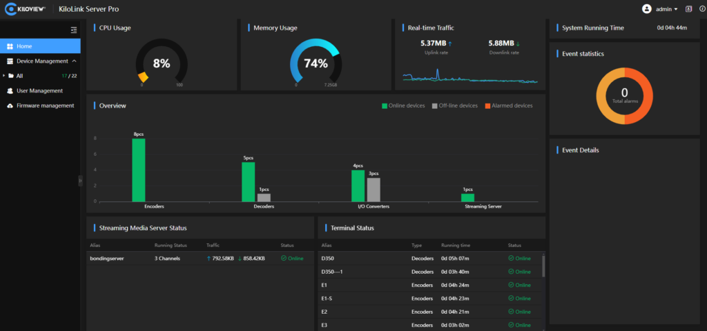 The official version of KiloLink Server Pro perfectly integrates the bonding and centralized management, providing users with visualized easy-operation. Without installing any client software, it is compatible with mainstream browsers including Chrome, Edge, and Safari. Users can intuitively manage and view device status, configure device parameters, switch to device page, monitor bonding link status, check streaming status, manage and upgrade firmware. All of these operations can be finished via WEB interface, Anytime, Anywhere.