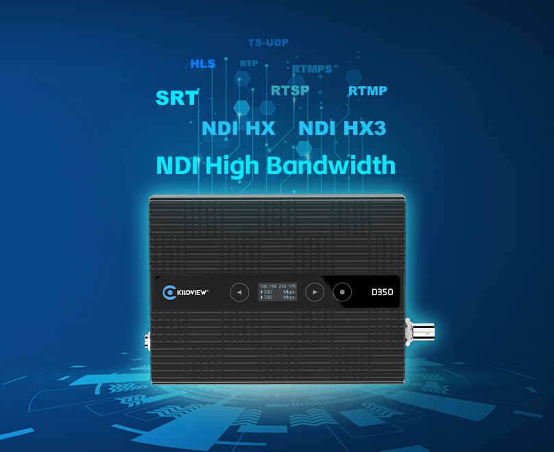 To accommodate your various workflows, D350 is compatible with all protocols, including NDI High Bandwidth, ND HX2, NDI HX3, SRT, RTMP, RTMPS, HLS, TS over UDP, RTP, and RTSP.