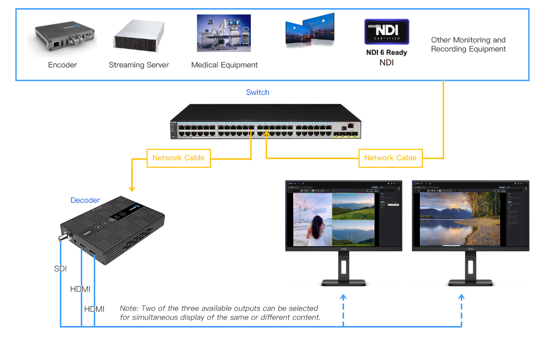 It supports 4K H.265/H.264 IP stream decoding, capable of simultaneously decoding and outputting up to 12 video streams, including 12 channels of 1080P30, 12 channels of 1080P60, 3 channels of 4KP30, and 2 channels of 4KP60. Additionally, the device supports SpeedHQ (NDI HB) decoding format, enabling simultaneous decoding and output of up to 4 video streams, including 4 channels of 1080P30, 4 channels of 1080P60, and 1 channel of 4KP30.