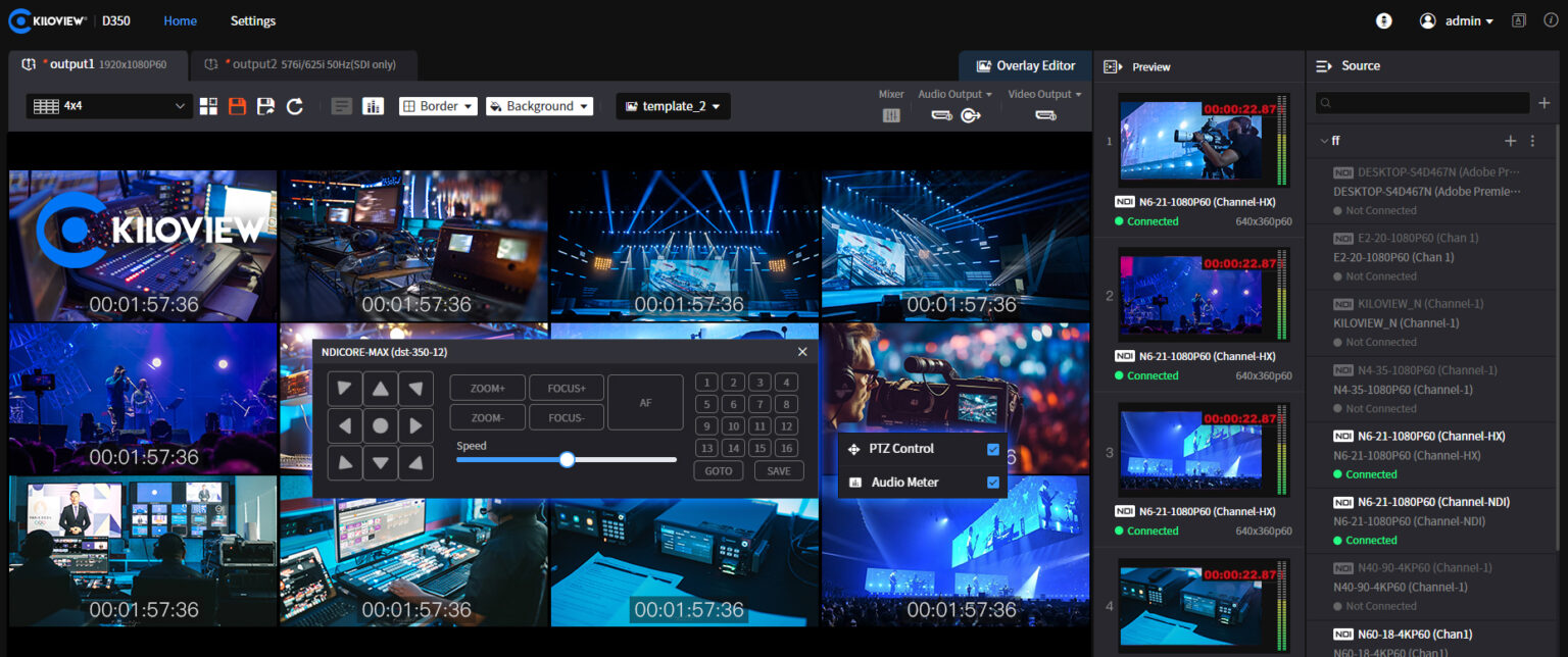D350 supports customizable output display screens, allowing users to freely choose between single-screen or various split-screen and picture-in-picture modes. You can dynamically select custom layouts ranging from 1/2/3/4/5/6/7/8/9 to 16 screens based on your needs, easily achieving dynamic output switching. All layout parameters, including position, size, and dimensions, are 100% customizable. You can also save custom multi-screen layouts, including the position and size settings of different video panes, as templates for future use.