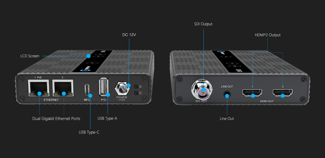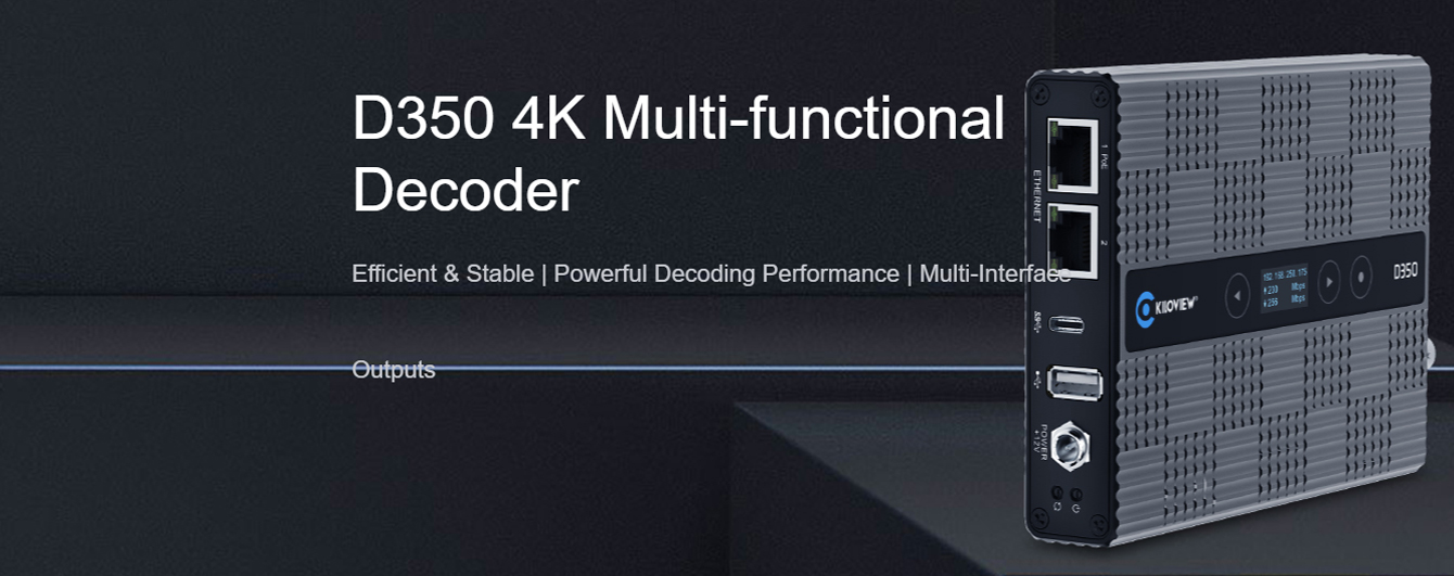 D350 4K Ultra HD Decoder is an all-in-one video processing device that supports decoding various network video stream formats, including NDI HB, NDI HX/HX3, SRT, RTMP, UDP, RTP, and RTSP, with stable audio and video synchronization via 3G-SDI and HDMI. It can decode up to 12 simultaneous 1080P60 video streams and features hardware-based Multiview monitoring for real-time preview switching.