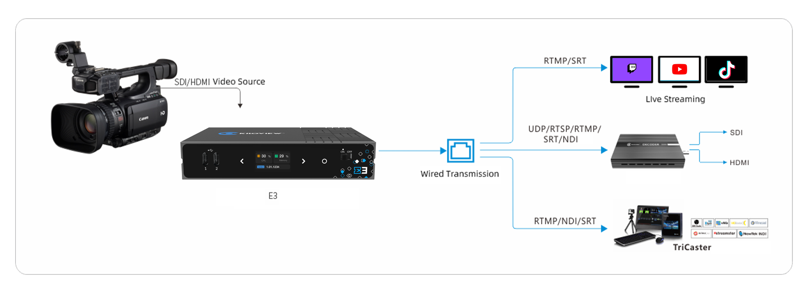 For broad applications, E3 supports a complete range of streaming protocols including NDI HX3/NDI HX2/SRT/RTMP/RTMPS/HLS/TS over UDP/RTP*/RTSP/Onvif*. It can be used for live production with NDI HX, remote production with SRT, live streaming with RTMP or HLS, or any transmission with all different protocols.