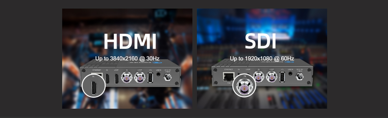 E3 allows encoding video sources from either port of 3G-SDI or HDMI, mixing both video sources into one output in PIP or PBP mode or even encoding video sources into up to 1080p60 from both ports of HDMI and 3G-SDI simultaneously for high-quality live streaming.