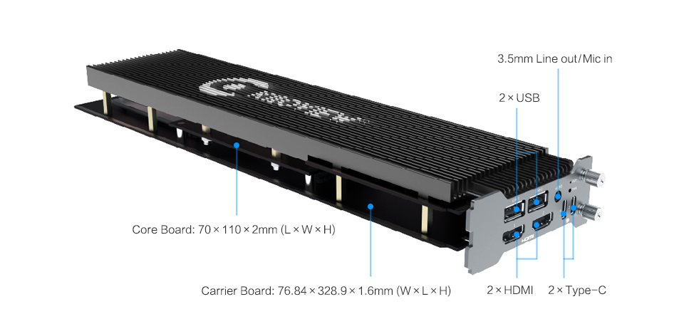FXC-A8600 Compute Card adopts a core-board and carrier-board separation architecture, achieving a flexible layout of high-speed interfaces including HDMI 2.1 and Type-C within its compact chassis. This architecture provides robust support for diverse scenarios such as 4K signal output and external I/O device connectivity.