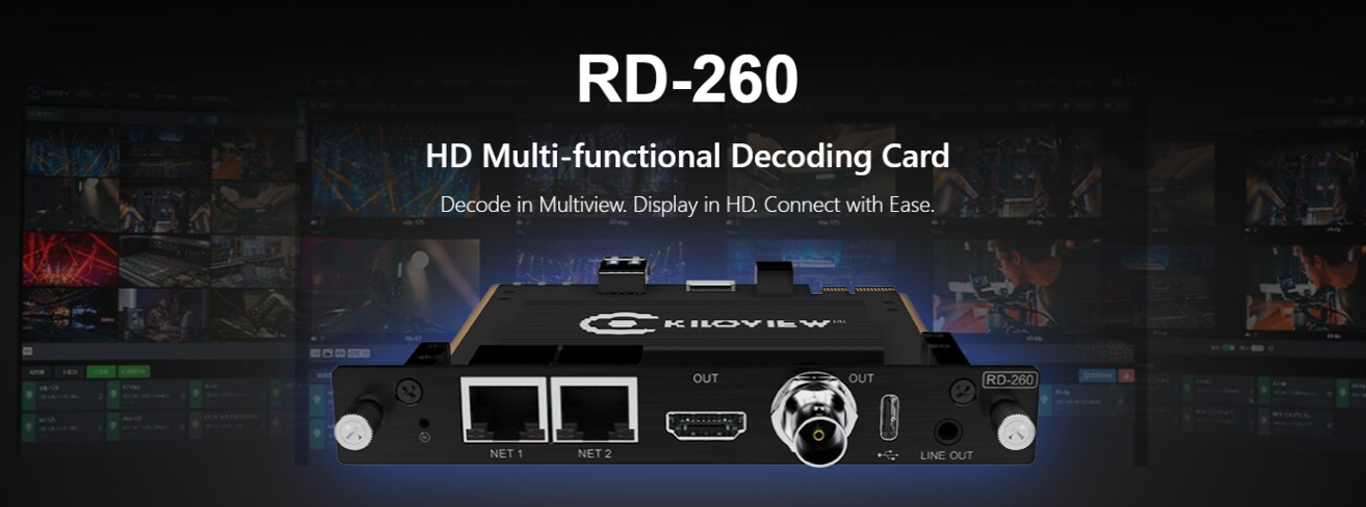 RD-260 is an HD video decoding card designed for Kiloview rackmount chassis RU01/RU03. It supports simultaneous decoding of up to 4 IP video streams with 3G-SDI and dual HDMI outputs, optimized for HD production and display.