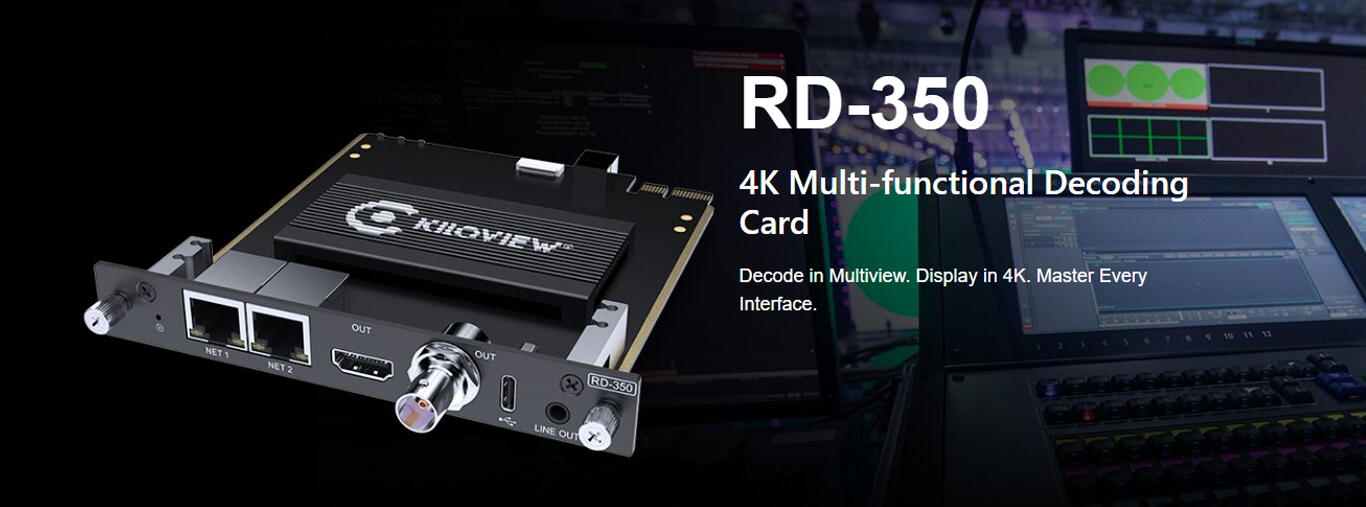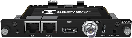 RD-350 is a 4K video decoding card built for Kiloview rackmount chassis RU01/RU03. It supports decoding of high-bandwidth NDI and up to 12 IP video streams simultaneously (up to 1080p60), outputting via HDMI and 3G-SDI with real-time preview on the web UI.