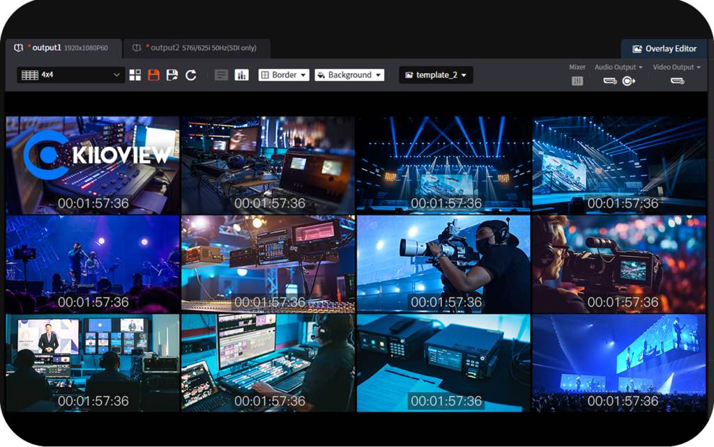 You can configure output layouts with 1 to 16 video windows, adjusting size and position as needed. The device allows saving custom layouts as templates. It also features an overlay editor for adding images, text, logos, and graphics to the video output.