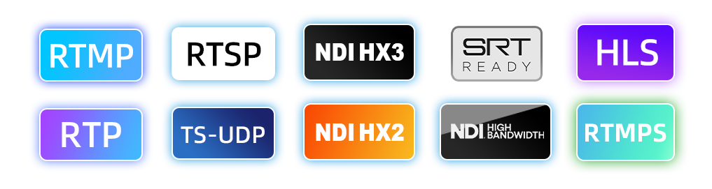 The RD-350 works with a wide range of streaming protocols including NDI HB, NDI HX2/HX3, SRT, RTMP/RTMPS, HLS, TS over UDP, RTP, and RTSP.
