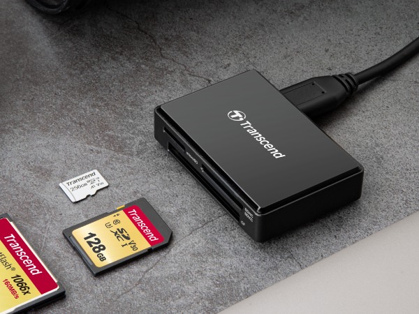 Transcend's RDC8 card reader is equipped with three slots for SD memory cards, microSD memory cards, and CompactFlash cards, offering you a convenient way to transfer different types of digital files with one compact card reader.