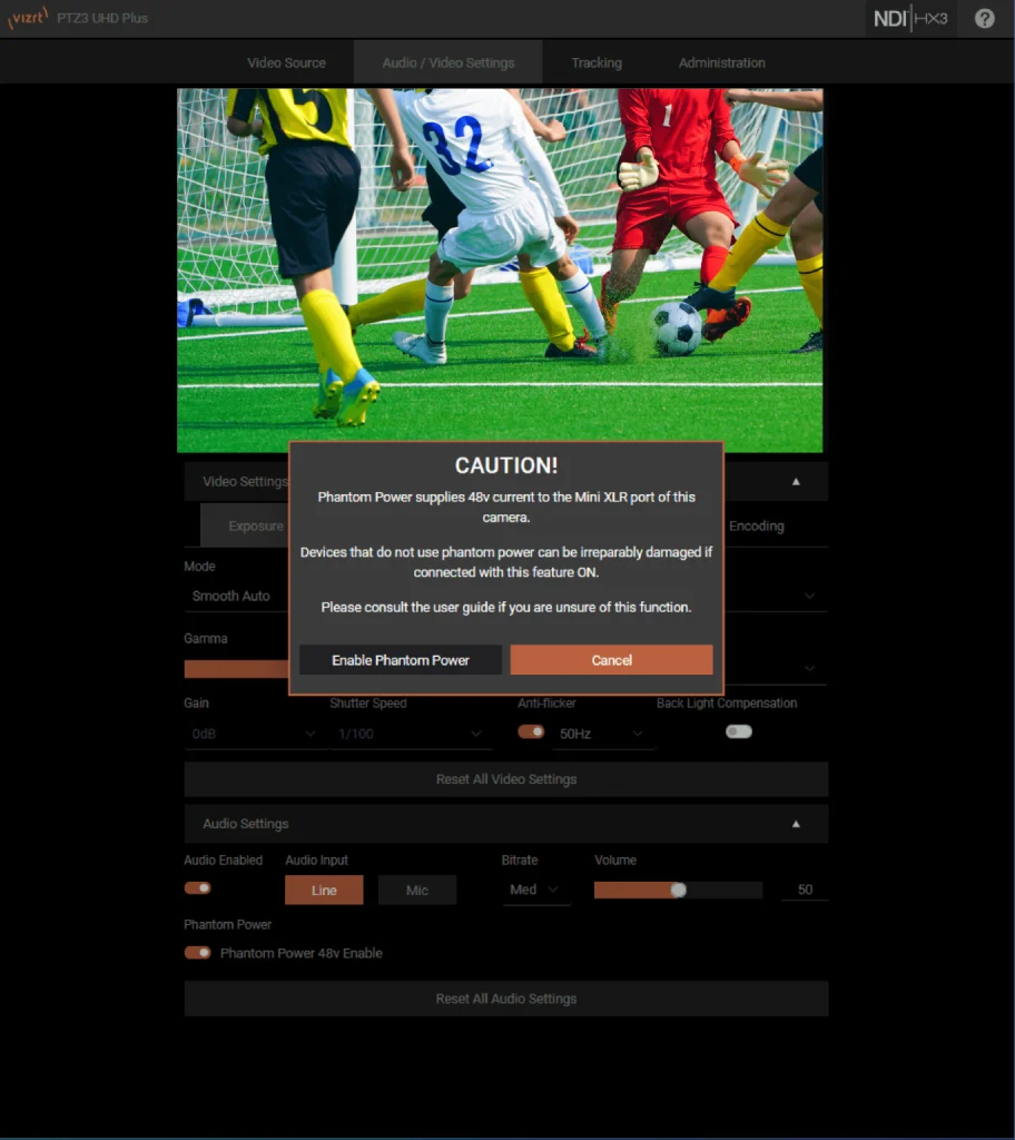 A simple and intuitive software control panel makes it easy to setup, configure, and adjust your PTZ3 PLUS cameras with pinpoint precision. Manage video sources, audio settings including phantom power, AI tracking, and device administration from one panel.