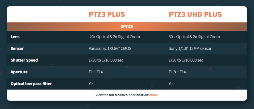 The PTZ3 PLUS and PTZ3 UHD PLUS cameras are available in black and white colorways and both provide the same software functionality. Your choice simply comes down to the resolution, zoom, and color that you need.
